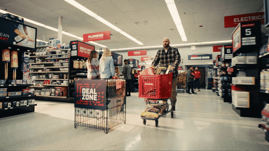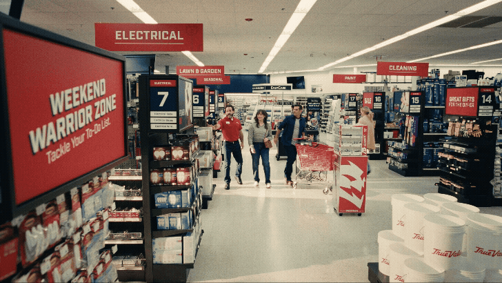 Early on in my calls with the creative team, it was clear that True Value stores were not meant to feel like big box stores. They wanted the stores to feel inviting and closer to home than a traditional store. I pitched the idea of using warm sunlight sources inside our store (even when we couldn’t see windows) as a way to thread the store and home locations. My DP Patrick Ouziel and the whole G&E team did a great job at taking the edge off the flourescents inside and pumping in some sunlight.